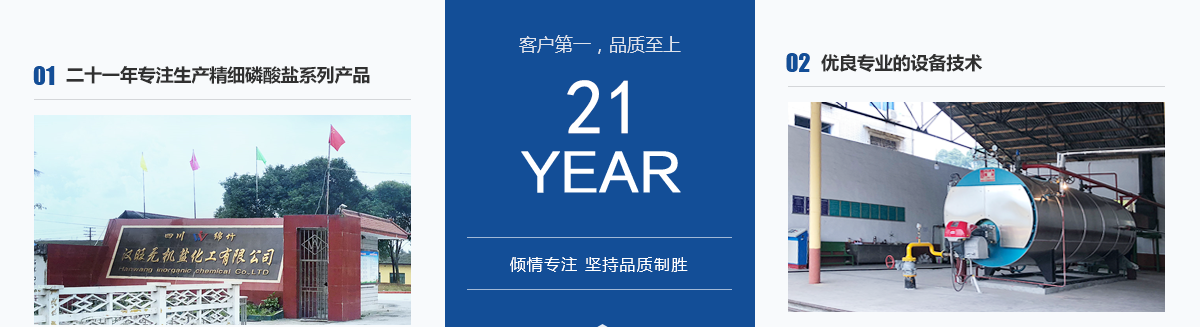 本公司位于四川省綿竹市漢旺鎮,是自1997年成立以來至今,已發展成為四川生產經驗豐富的精細磷酸鹽系列產品專業生產廠家,地理位置優越,毗鄰四川新市和拱星工業園區,與什邡磷化工生產基地交相輝映。主要生產產品有:磷酸二氫鉀、酸式磷酸鉀、磷酸氫二鉀、磷酸脲、磷酸二氫鈉、磷酸氫二鈉、磷酸三鈉、磷酸二氫銨、磷酸氫二銨等系列磷酸鹽產品。